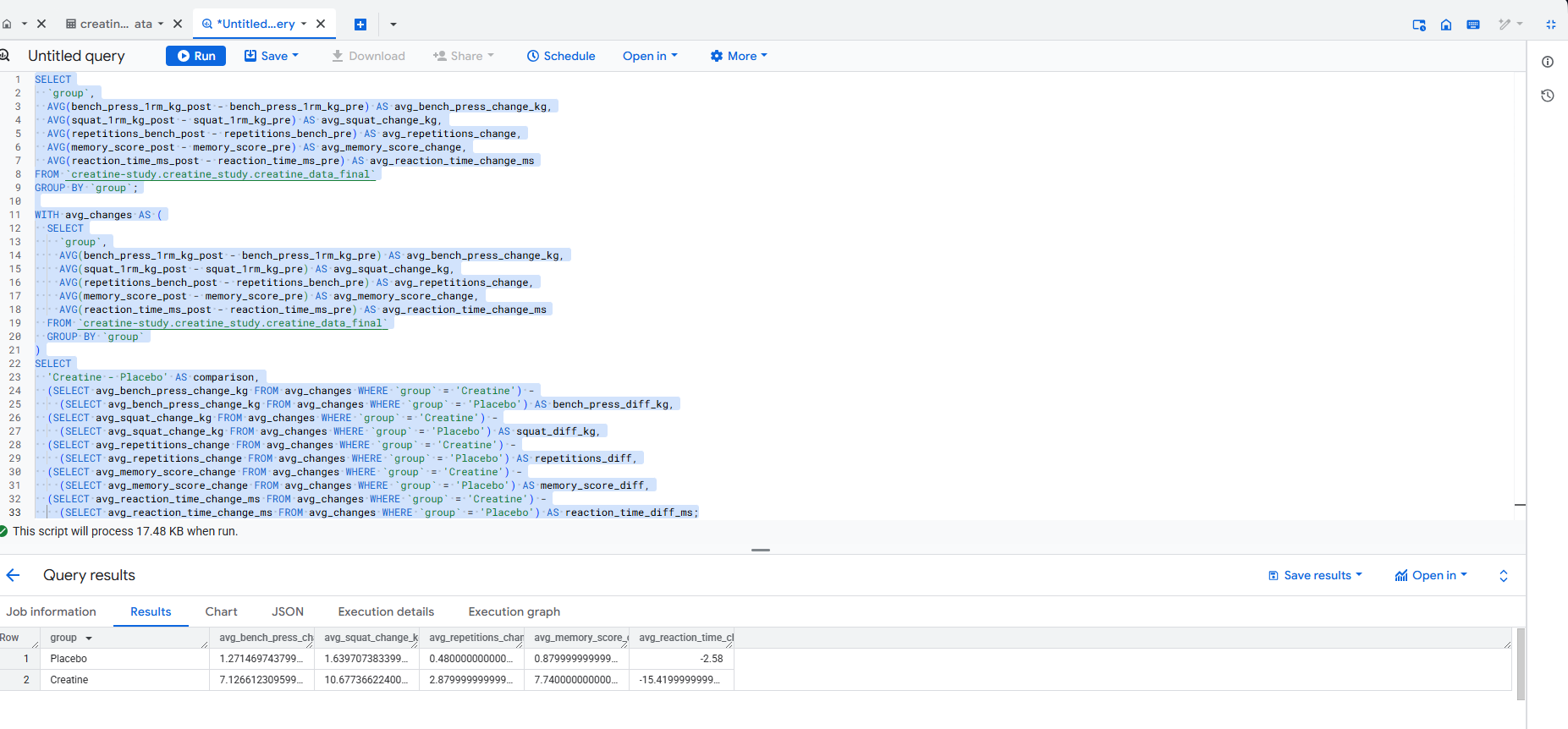 Used BigQuery to clean and preprocess the dataset for the Creatine Study, handling missing values and ensuring data consistency. Below are example SQL queries used for analysis and cleaning, along with a screenshot of the BigQuery interface.