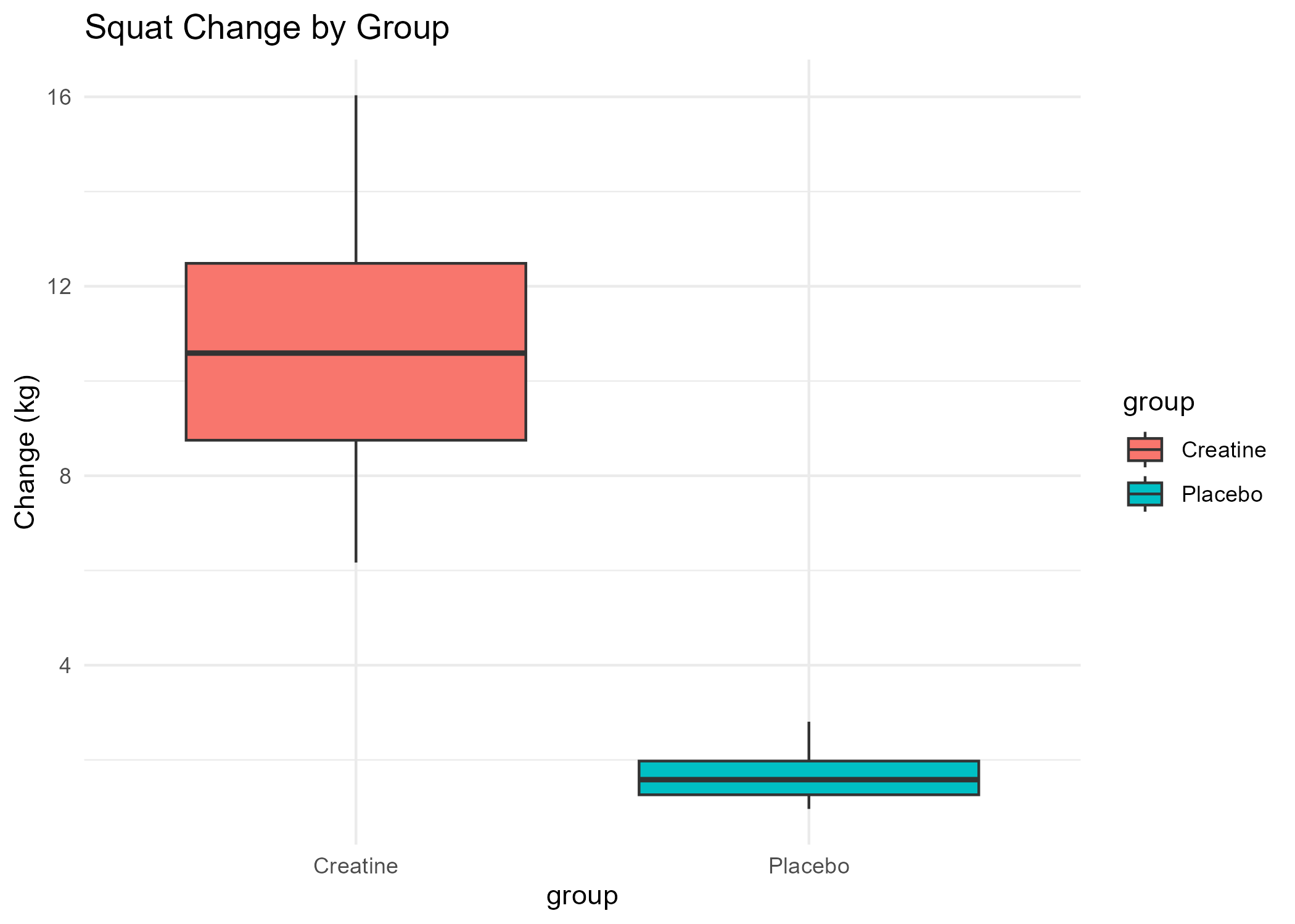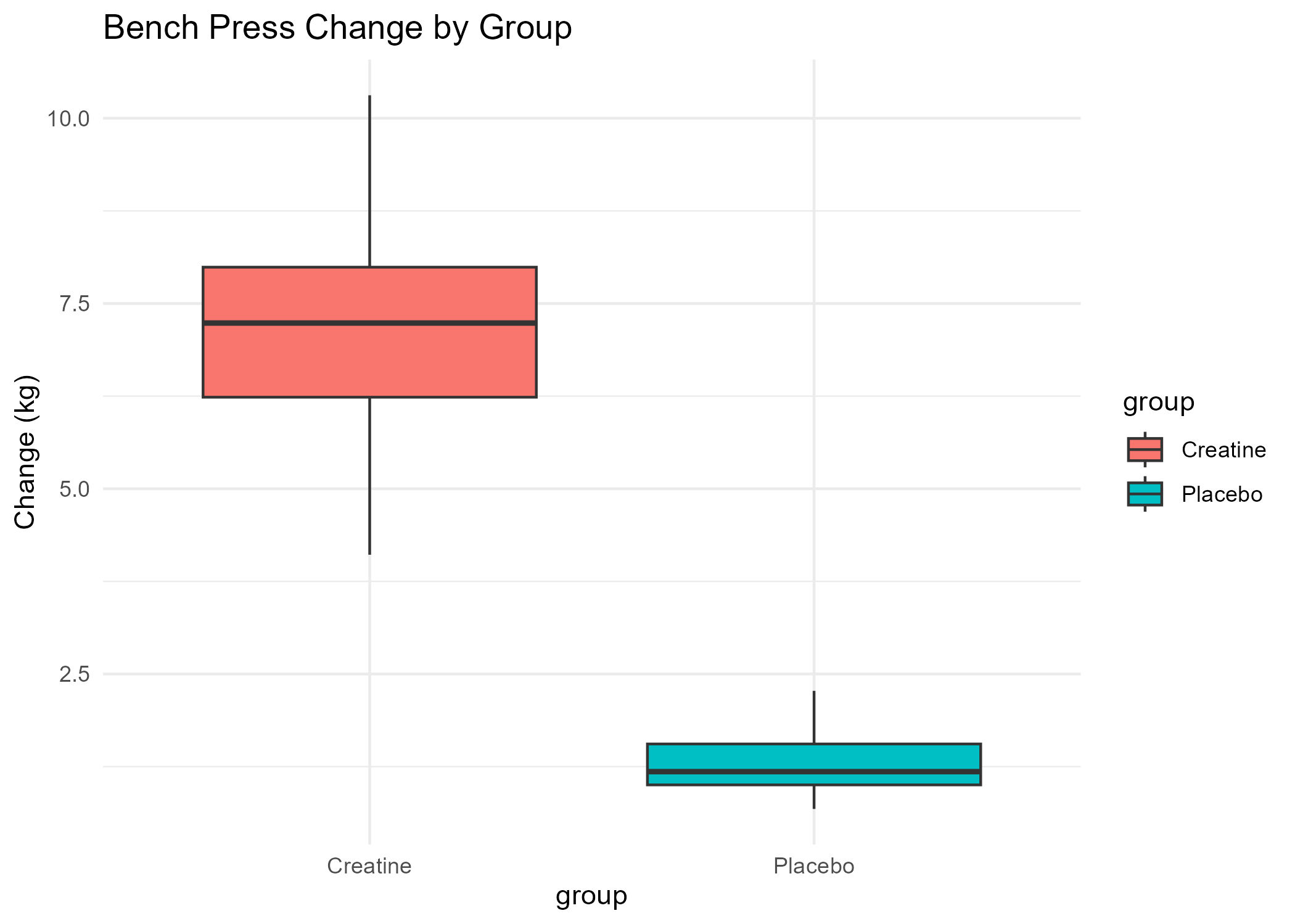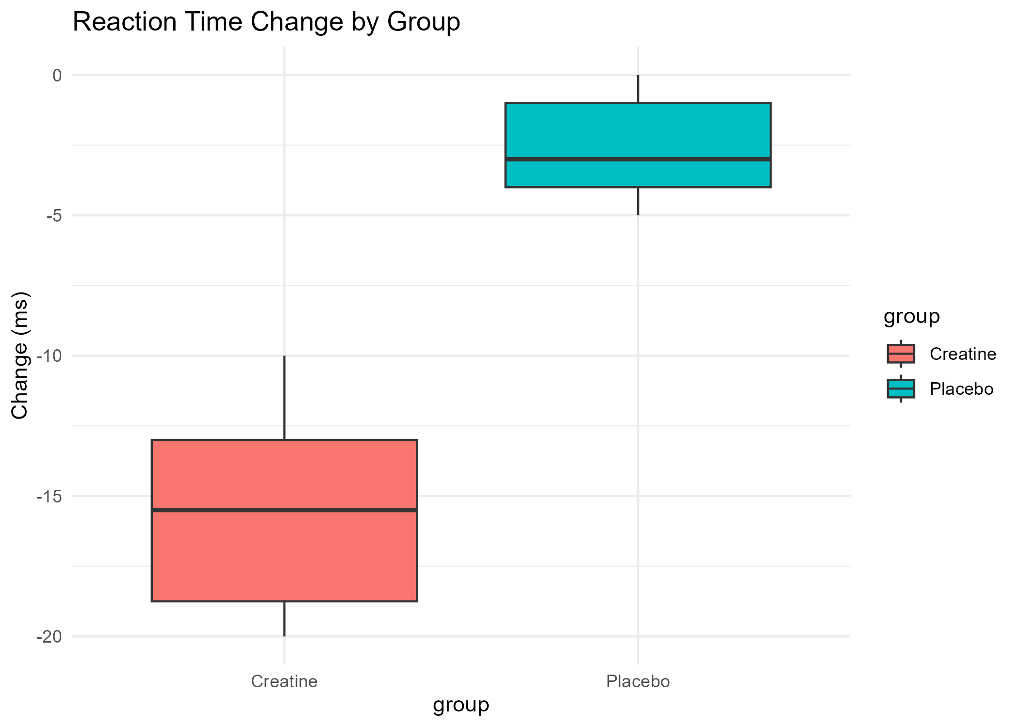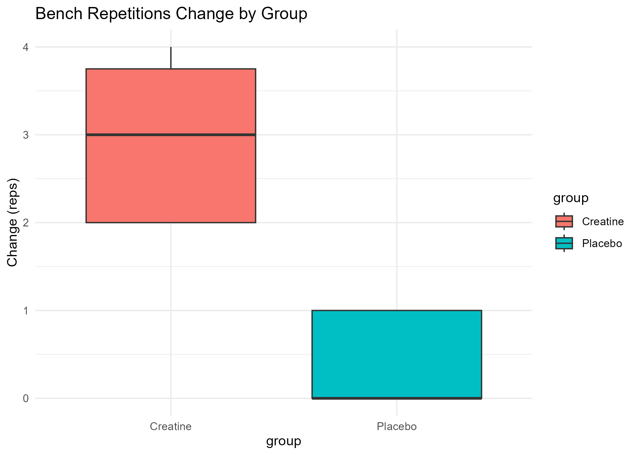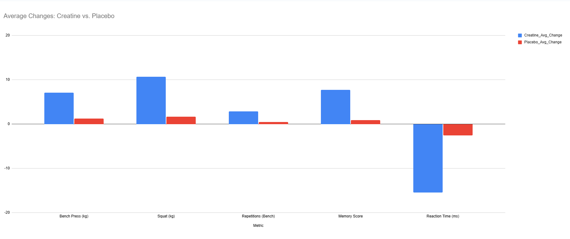 Calculated the average change in metrics (bench press, squat, repetitions, memory score, reaction time) for each group (Creatine and Placebo), and computed the differences between groups to quantify the effect of creatine supplementation.