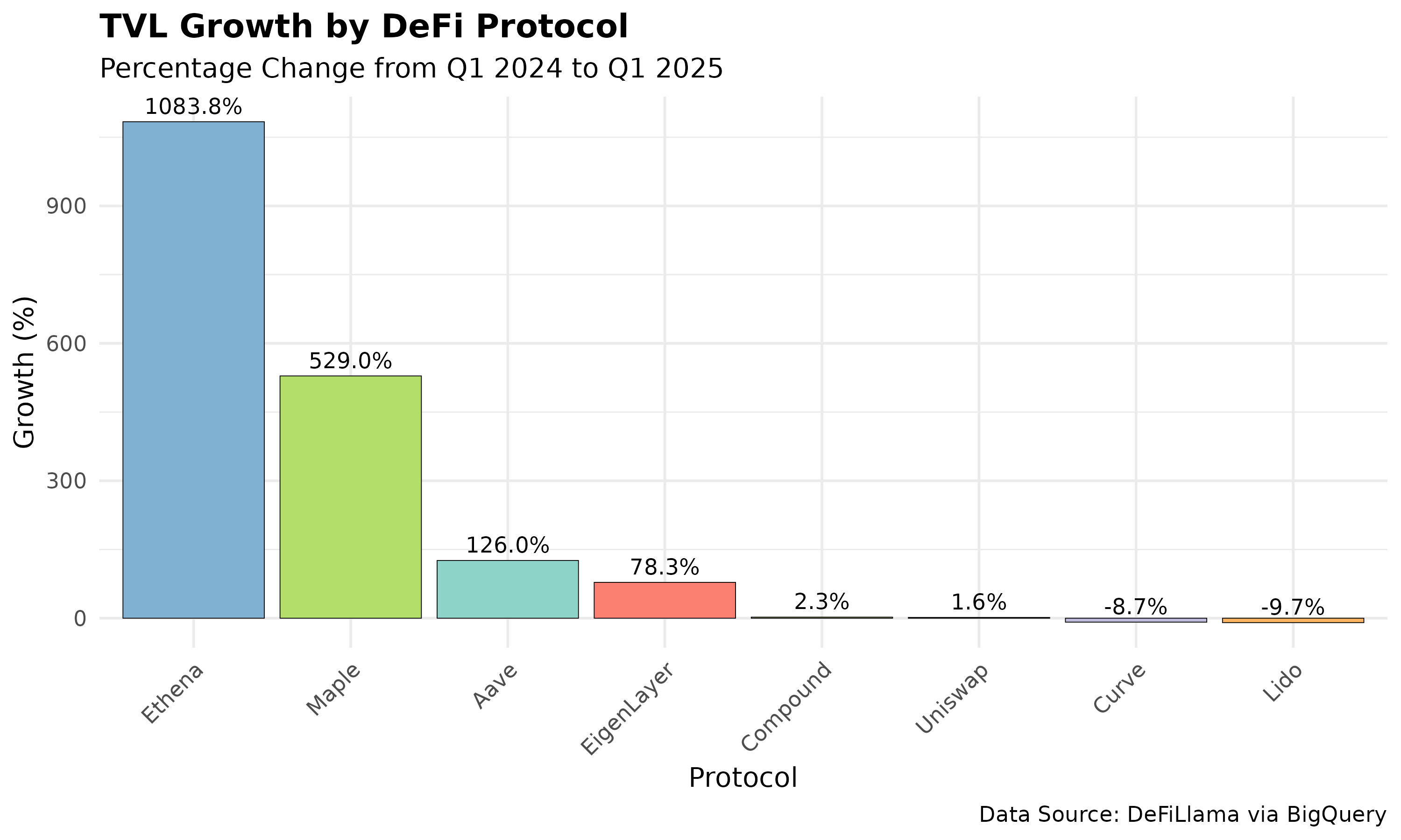 - Ethena led with 1083.8% TVL growth, driven by its yield-bearing USDe stablecoin and institutional investments.