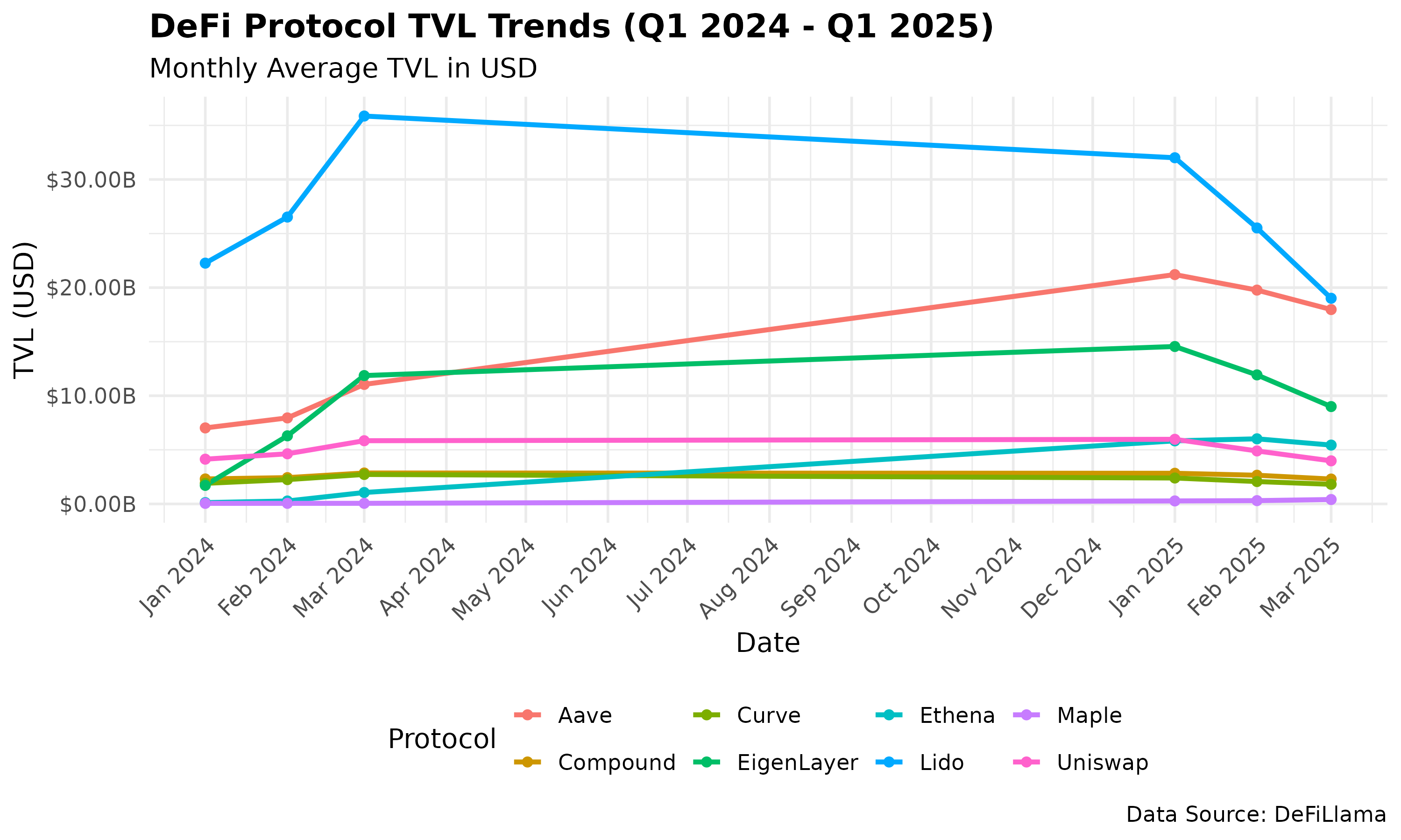Analyzed Total Value Locked (TVL) growth for eight DeFi protocols (Uniswap, Aave, Maple, Compound, Lido, EigenLayer, Curve, Ethena) from Q1 2024 to Q1 2025 to identify the fastest-growing protocol. Used Python for data fetching, Google Sheets for cleaning, BigQuery for growth calculations, R for visualizations, and Tableau for an interactive dashboard.