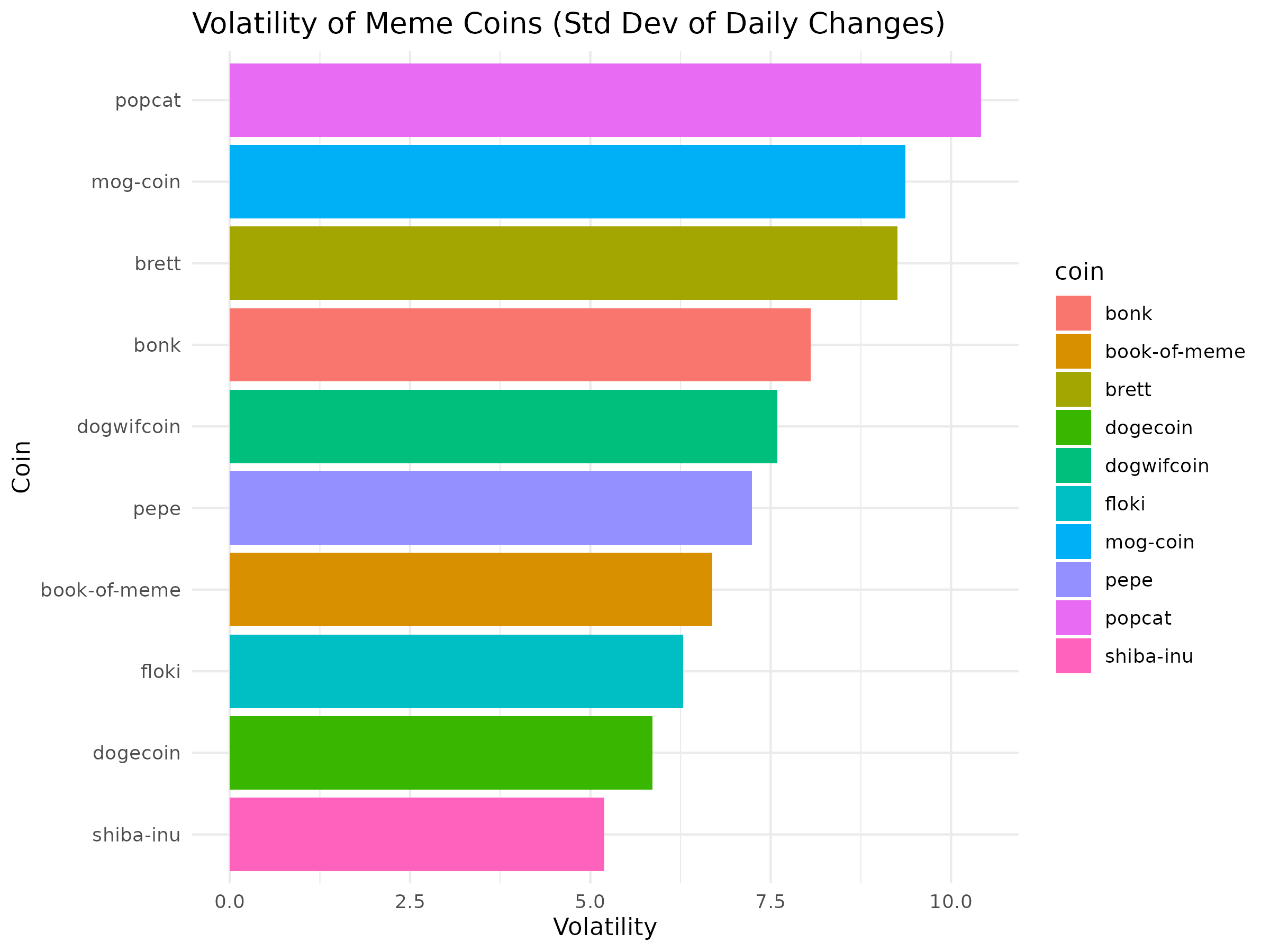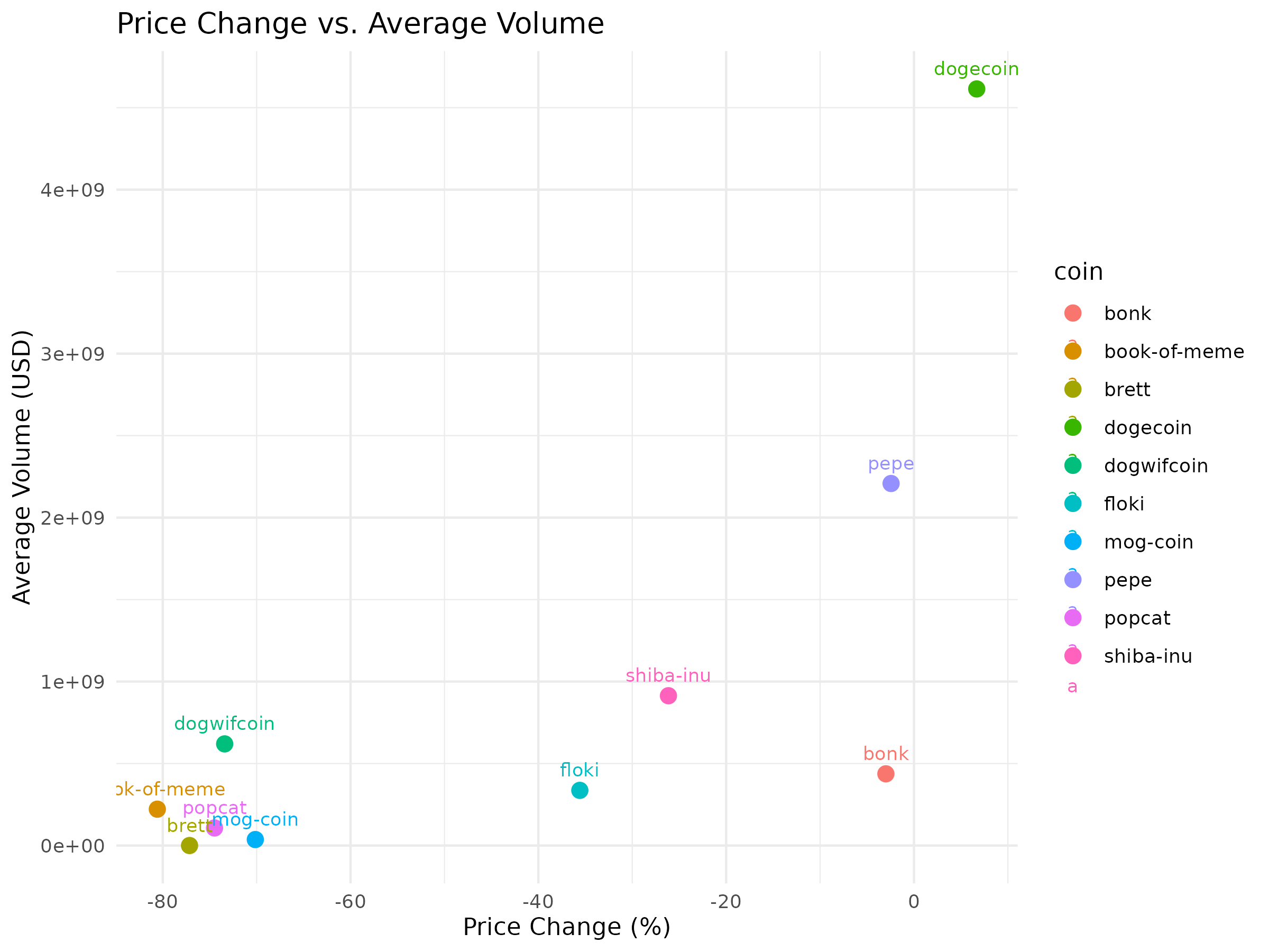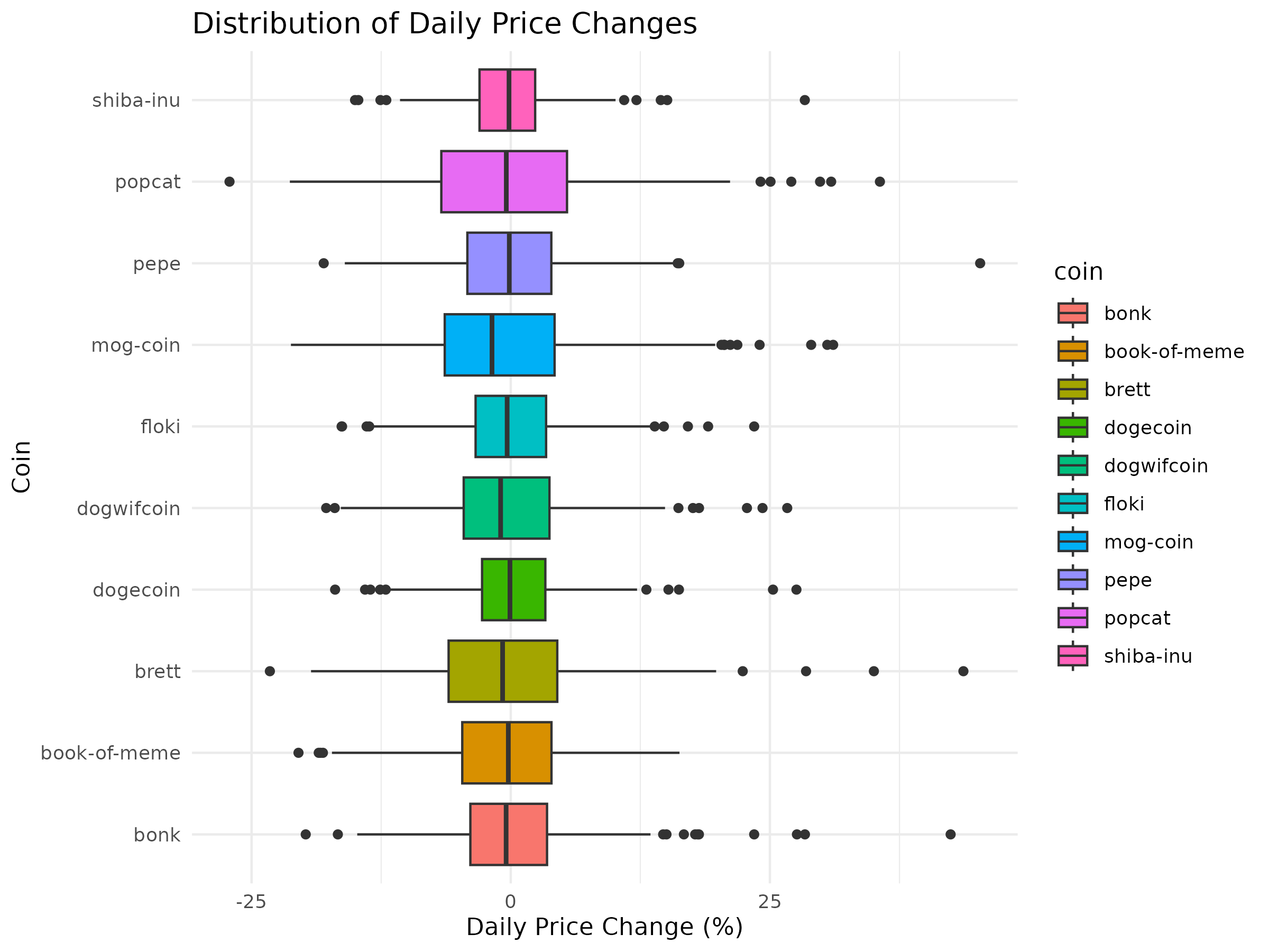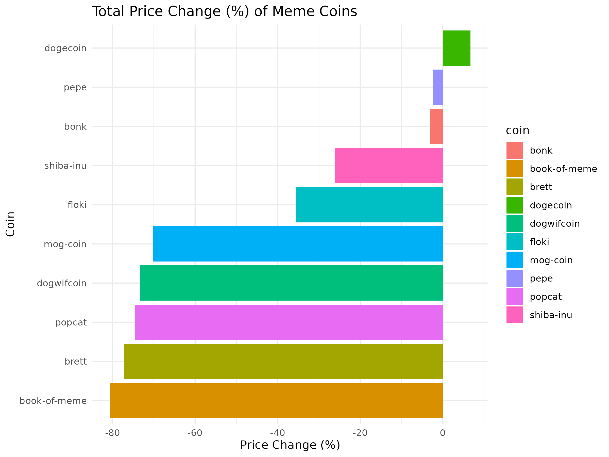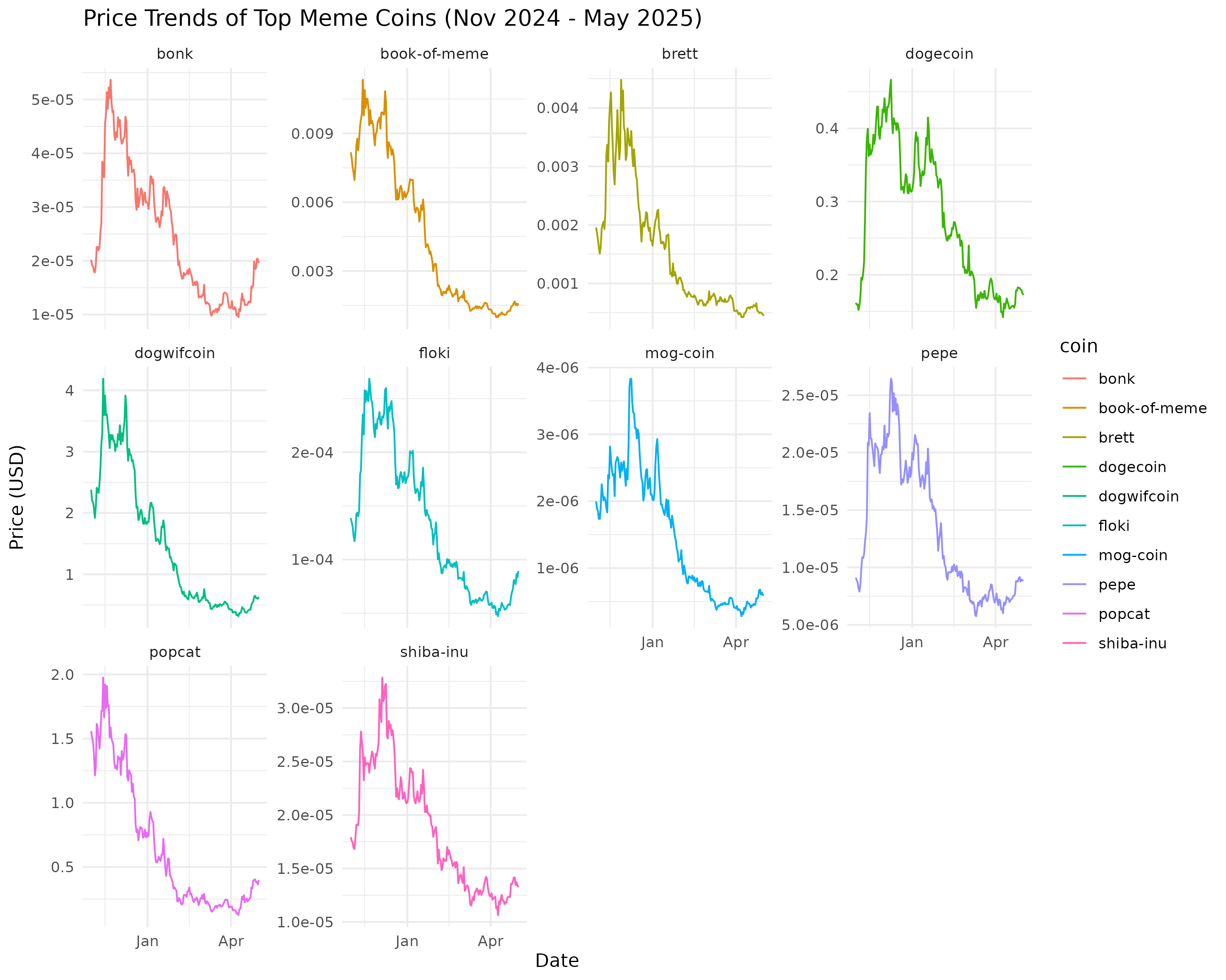 Analyzed the performance of top meme coins (e.g., Dogwifcoin, Floki, Pepe) from November 2024 to May 2025 using Python, SQL, R, and Tableau. Includes data fetching, processing, analysis, visualizations, and investment recommendations.